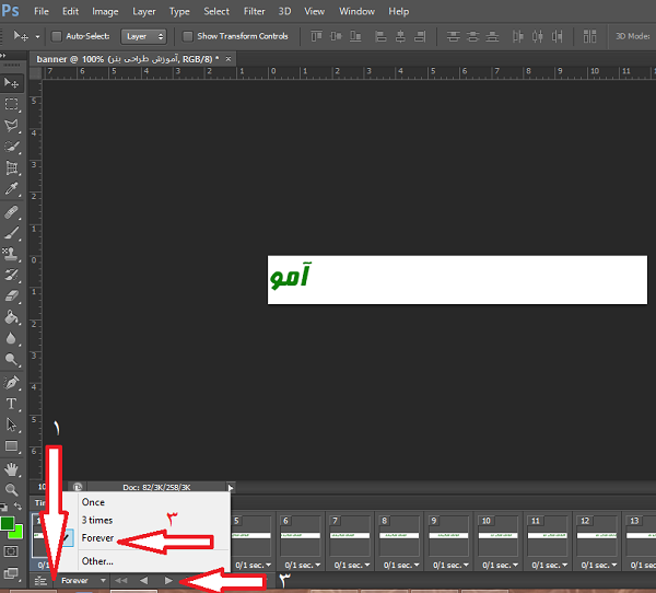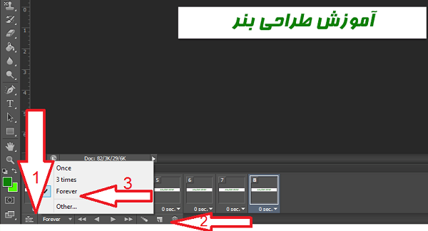 برای مشاهده نتیجه مطابق تصویر عمل میکنیم و روی دکمه به "پلی" کلیک می کنیم، و همینطور می توانیم تعداد دفعات تکرار را هم تعیین کنیم، معمولا بنرهای تبلیغاتی دائما در حال حرکت هستند و ماهم اینجا forever را انتخاب میکنیم