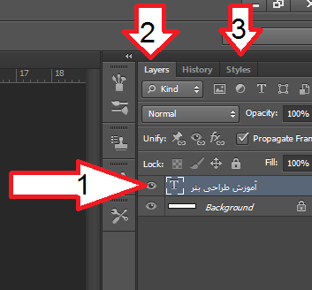 و حالا لایه ی متنی را انتخاب میکنیم و به بخش style میرویم،اگر شما تب های layer و style را مشاهده نمیکنید،تیک فعالسازی آن را در بخش windows بزنید.