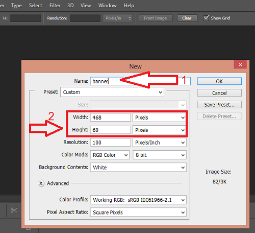 حالا ابعاد بنر مورد نظر را وارد می کنیم و در نامی برای آن در نظر میگیریم: